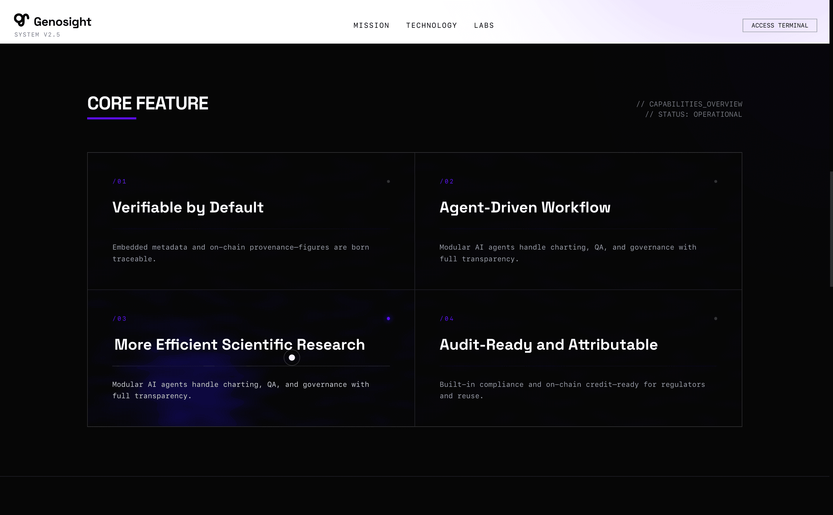 Genosight is a decentralized science (DeSci) initiative creating an agent-native system that converts static scientific figures into structured, auditable assets. AI agents generate, validate, and trace figures across their entire lifecycle—from raw data to final publication. With on-chain provenance anchoring metadata, parameters, and intent, Genosight ensures reproducibility and trust. We partnered with Genosight to design their product experience, craft strategic communications, and build a unified brand identity that reflects their pioneering role in verifiable scientific infrastructure.